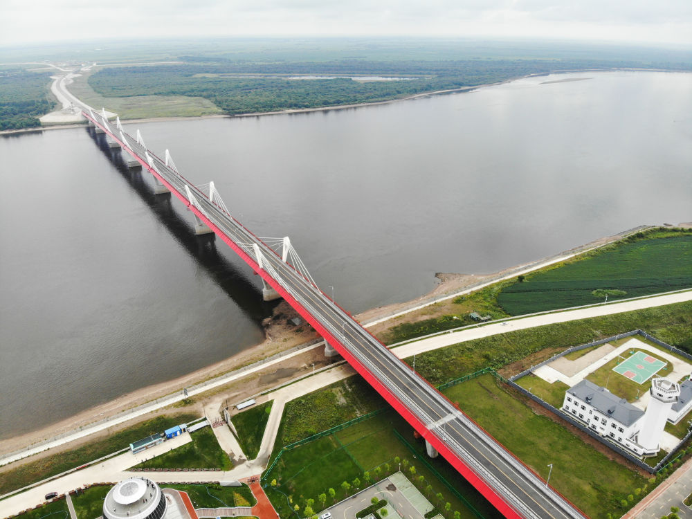 這是2023年8月11日在中國(guó)黑河一側(cè)拍攝的黑河-布拉戈維申斯克公路橋(無(wú)人機(jī)照片)。新華社記者 王松 攝