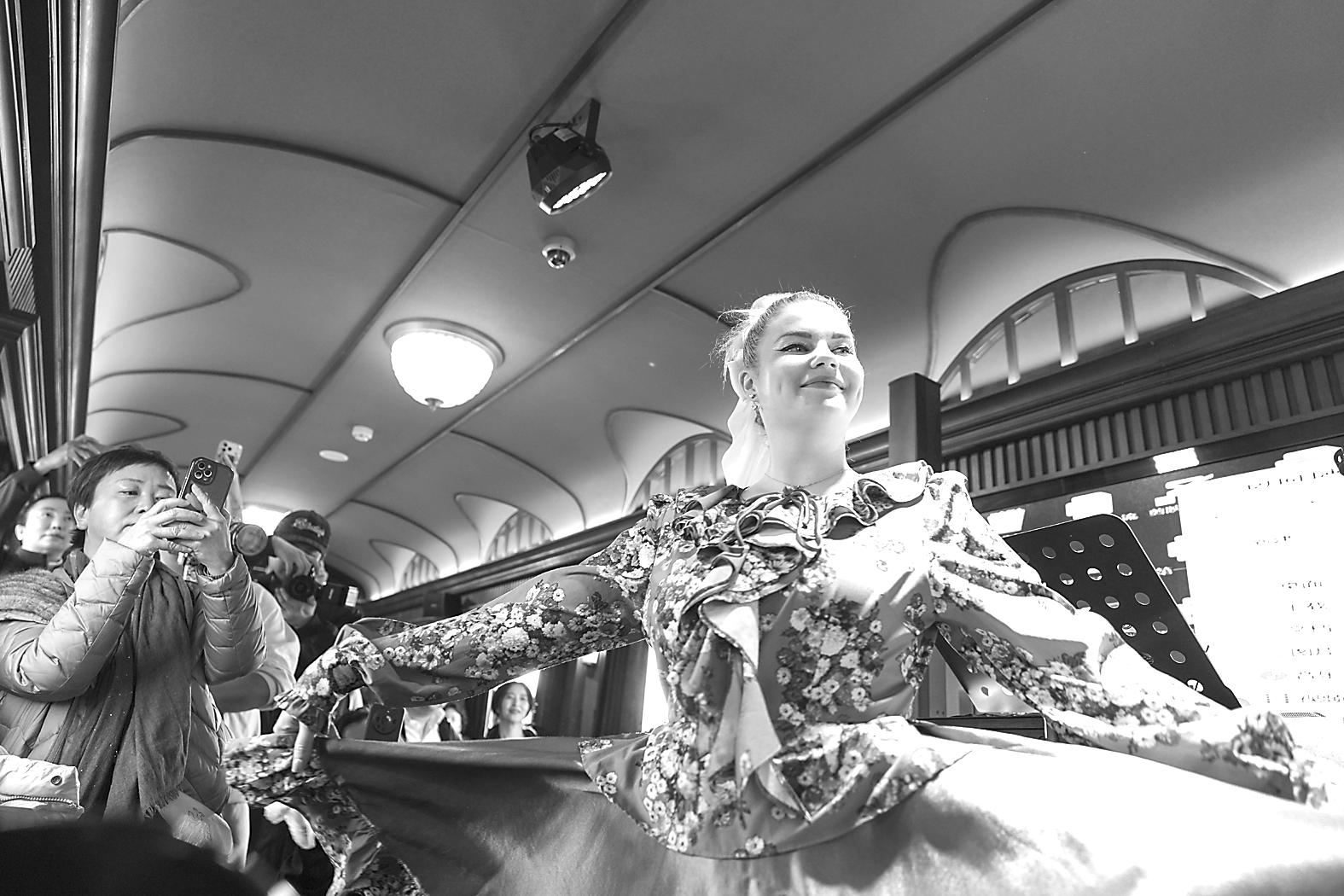 12月6日,演職人員在“伊春號(hào)”旅游專列車廂中表演。
