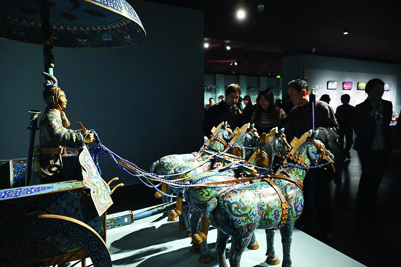 12月15日,觀眾參觀展出的景泰藍(lán)作品《兵馬戰(zhàn)車》。