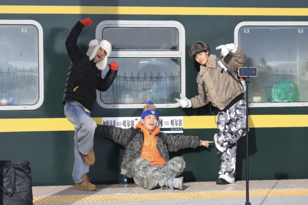 游客在漠河站站臺上與K7041次“雪國列車”合影留念。 新華社發(fā)(徐率攝)