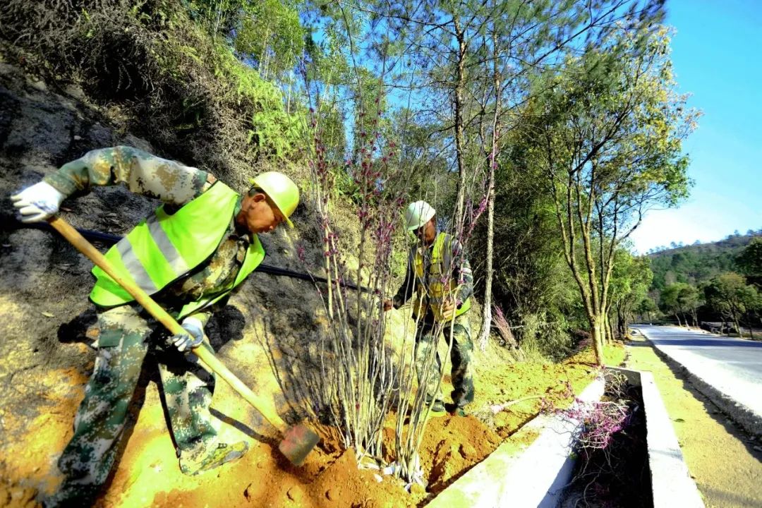 上圖為環(huán)武夷山國家公園保護發(fā)展帶“251”交通環(huán)線上,工人們加緊對道路兩側(cè)進行綠化、花化、彩化。