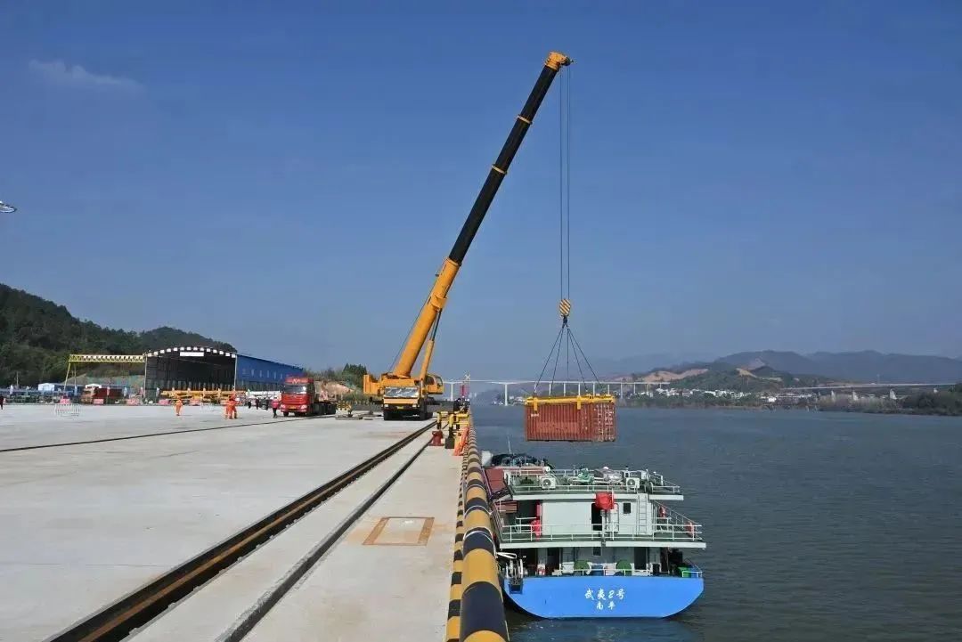 上圖為武夷2號貨輪在南平港延平新城港區(qū)洋坑碼頭卸貨