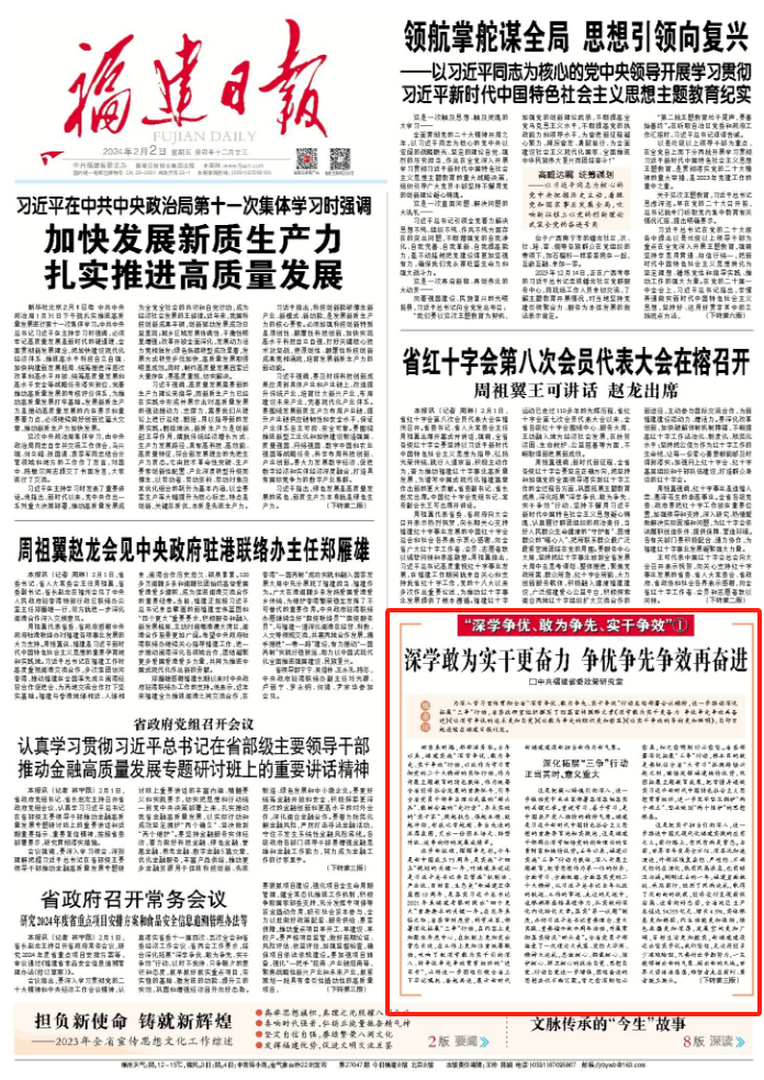 為深入學(xué)習(xí)宣傳貫徹全省“深學(xué)爭優(yōu)、敢為爭先、實(shí)干爭效”行動(dòng)總結(jié)部署會(huì)議精神,進(jìn)一步推動(dòng)深化拓展“三爭”行動(dòng),省委政研室組織撰寫了四篇宣傳闡釋文章《深學(xué)敢為實(shí)干更奮力 爭優(yōu)爭先爭效再奮進(jìn)》《讓深學(xué)爭優(yōu)的追求更加自覺》《讓敢為爭先的膽識(shí)更加彰顯》《讓實(shí)干爭效的導(dǎo)向更加鮮明》,自2月2日起連續(xù)在福建日?qǐng)?bào)刊發(fā)。
