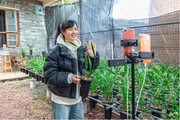 村民正通過(guò)網(wǎng)絡(luò)直播銷售庭院蘭花
