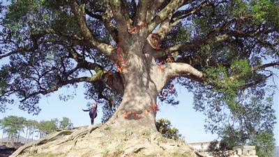 雄姿凜然,遒勁依然。古樟矗立,高近30米,需10人才能合抱。抬頭仰望,樹冠如云疊翠,枝葉稠密常青,彌漫著千年不散的香氣;俯身細(xì)看,根脈縱橫,周身紋理交錯(cuò),一道溝壑,一個(gè)樹瘤,不僅是一幅古老生命歷久彌新的真實(shí)寫照,也是人與自然和諧相處的生動(dòng)展示。