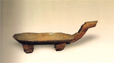 白巖船棺內(nèi)發(fā)現(xiàn)的一件龜形木盤也引人注目。盤身橢圓形,呈龜首短尾狀,內(nèi)平底微凹,外底附有四個(gè)矮方柱形足,器身通高0.32米。整體形似一只爬動(dòng)的大龜,刻畫得十分形象。