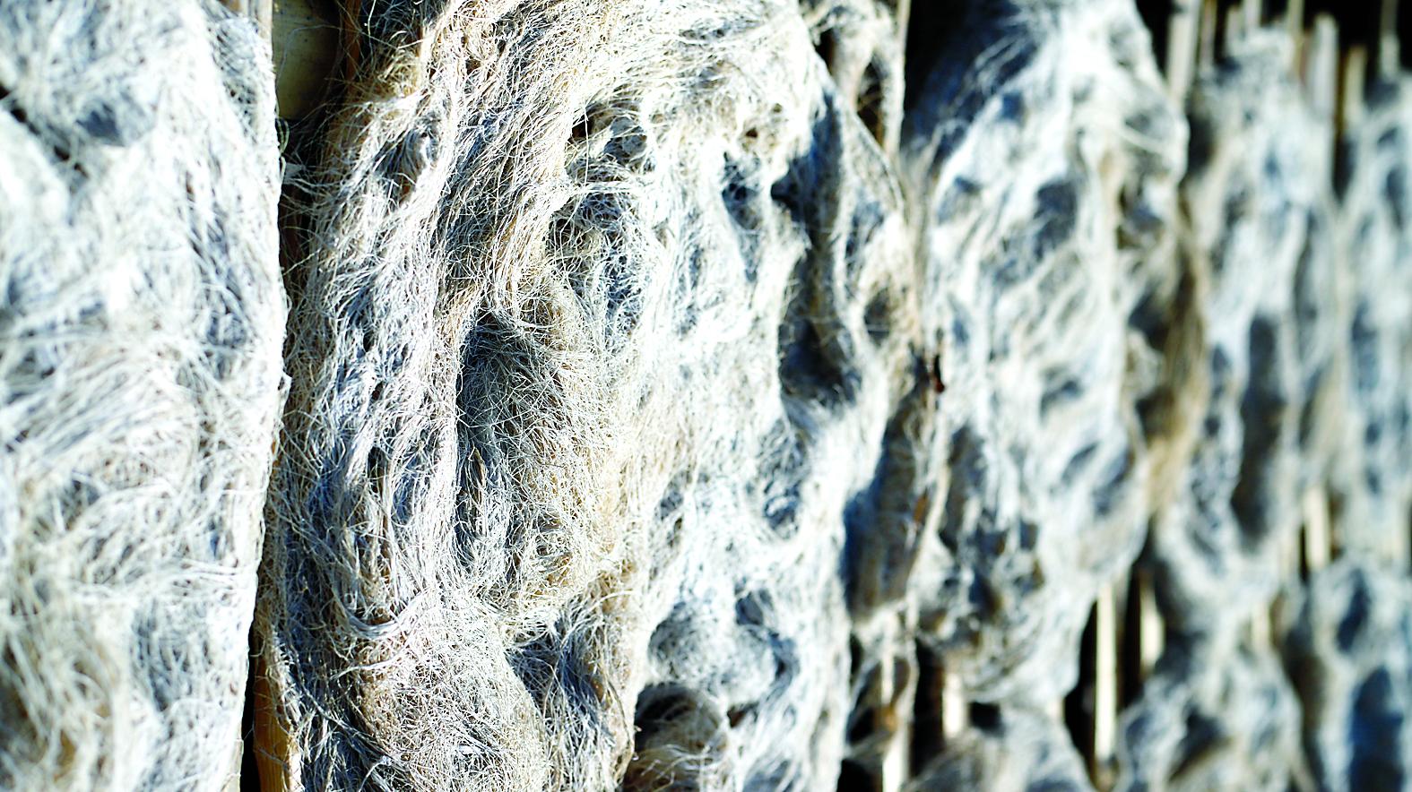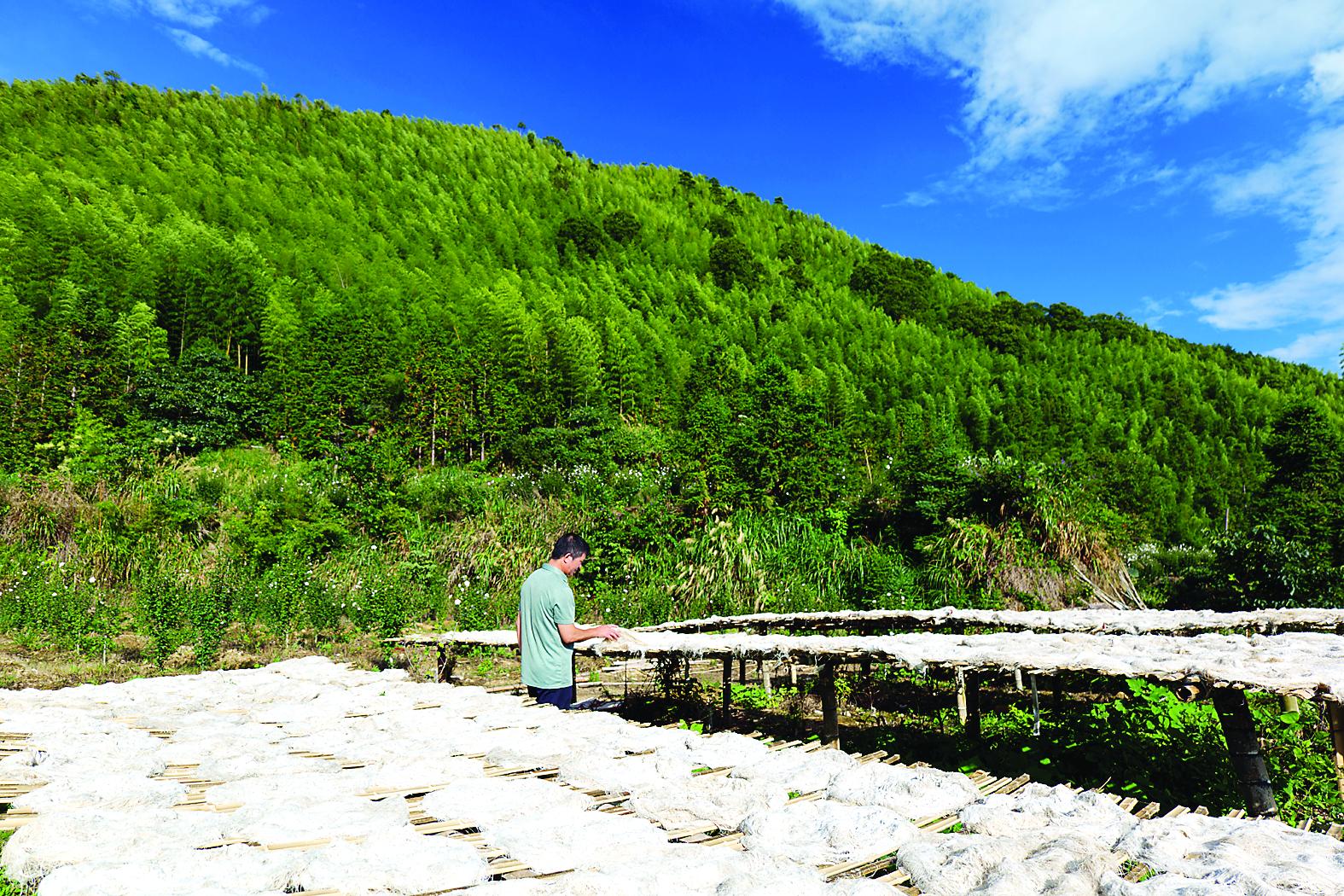 造紙坊前,垂掛著一排排竹絲,山泉潺潺流入浸泡池?!敖莩睾图埐劾锏挠盟紒碜陨缴稀!毙軕?yīng)忠介紹,制作連史紙的材料來自立夏前后的嫩竹,砍成大小合適的竹段,從下至上、由厚到薄堆放,并且在山泉水里浸泡數(shù)月。微生物逐漸分解著竹子中的糖分,直到竹皮可輕易剝落,竹肉也可以輕易分離成竹絲。剝下的竹絲在晾曬后,像一把把白色的線面。再經(jīng)過“三蒸三曬”后,按照古法,竹絲會(huì)被制成直徑約六十厘米的竹纖維料餅,攤放在山間的晾曬架上。陽光作為“漂白劑”,雨水則能洗去發(fā)酵殘留的物質(zhì)。數(shù)月后,竹絲潔白如雪。