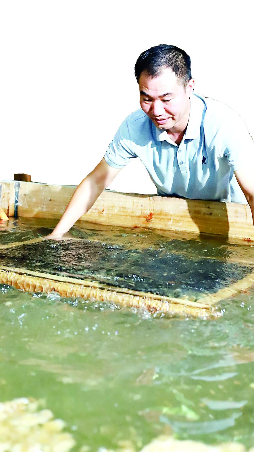 紙坊里,幾位傳承人輪流為我們講解、演示抄紙、焙紙的工序。與江西鉛山已形成規(guī)?;蛯I(yè)分工生產(chǎn)的“連四紙”相比,烏石村還處在“一人多崗”的起步階段?!拔覀儸F(xiàn)在是哪里缺人就頂上,備料、抄紙、焙紙等所有環(huán)節(jié)都要試?!毙軕?yīng)忠說,等以后有人愿意學(xué),才可能細(xì)化分工。