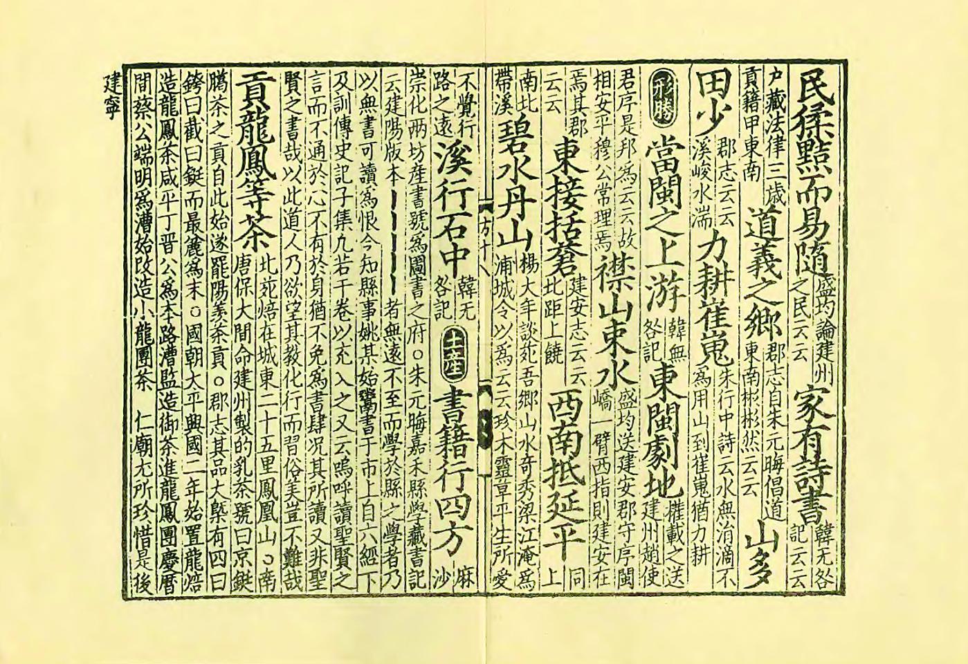 明嘉靖版的《建陽縣志》稱:“書市在崇化里,比屋皆鬻書籍,天下客商販者如織,每月以一、六日集?!敝祆涞茏幼D略帉憽斗捷泟儆[》一書,其中介紹建寧府土產(chǎn)時(shí),把“書籍行四方”列在“貢龍鳳等茶”“兔毫盞”之前??梢娫谧D卵壑校ū颈蓉暡?、建盞更能代表建寧府。