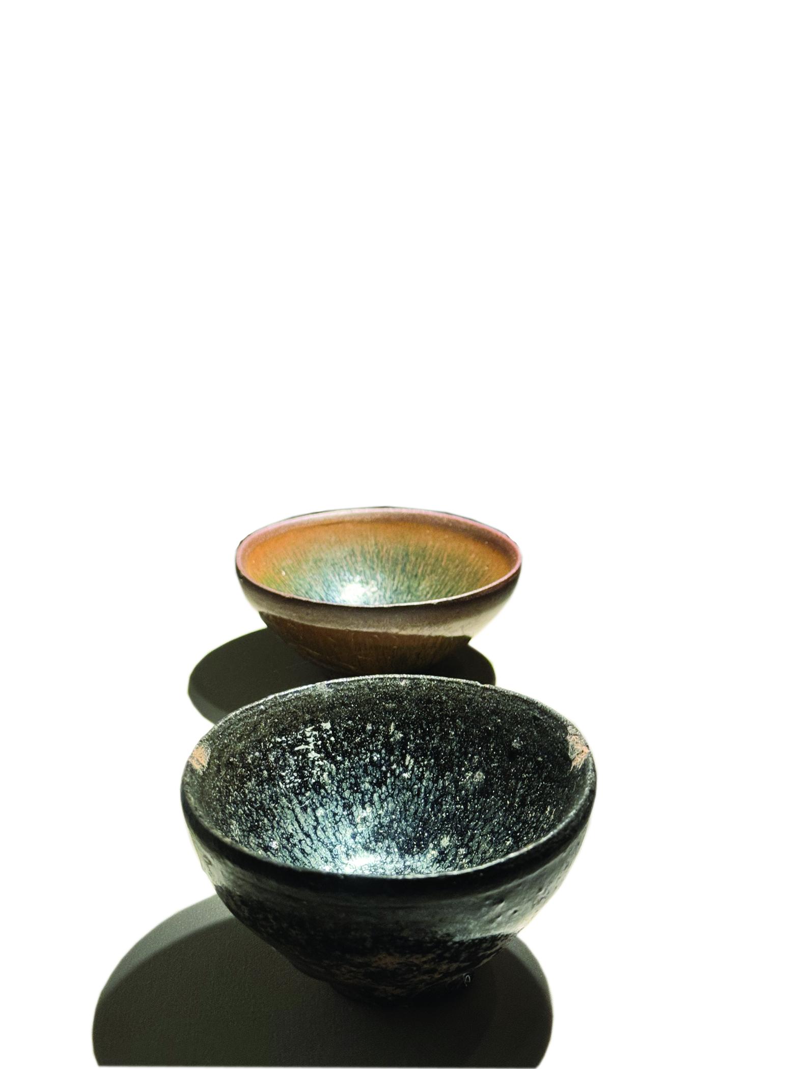 “松風(fēng)轉(zhuǎn)蟹眼,乳花明兔毛”,建盞的輝煌時(shí)代要追溯到兩宋時(shí)期,因斗茶而聞名,曾被列為“御供”之物。盞因茶而興,茶因盞而榮。在宋代,無(wú)論廟堂與江湖,總有文人雅士乃至帝王貴胄參與其中。要取得斗茶的最佳效果,需要有優(yōu)質(zhì)的器皿。蔡襄在《茶錄》中記載:“茶色白,宜黑盞,建安所造者紺黑,紋如兔毫,其坯微厚,最為要用?!奔由辖ūK的造型口大、足小、底深,適合運(yùn)筅擊拂,打出白沫后黑白分明。正如范仲淹在《和章岷從事斗茶歌》中所言,“紫玉甌心雪濤起”,白乳浮盞面,似乳花潔白,如疏星淡月。因此,建盞成為當(dāng)時(shí)最上乘的斗茶用具。隨著飲茶方式的改變,建盞也慢慢淡出了歷史的舞臺(tái)。