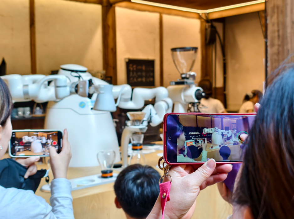 不單是當(dāng)?shù)卣皩櫽慰汀保懦抢锖芏嚅T店也花式出招,把游客“寵上天”。古街的雀替咖啡就推出了2024年世界智能產(chǎn)業(yè)博覽會(huì)上亮相的5GAI咖大師,它是一款雙臂六軸機(jī)器人,可復(fù)刻世界咖啡師大賽冠軍的沖泡手法,為游客提供一杯經(jīng)典雅致的手沖咖啡。