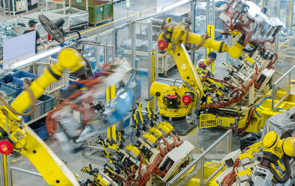 浙江省湖州市長興經(jīng)濟(jì)技術(shù)開發(fā)區(qū)的長興地通汽車部件有限公司技術(shù)人員操控工業(yè)機器人生產(chǎn)新能源汽車配件(無人機照片,2025年10月9日攝)。新華社發(fā)(譚云俸 攝)