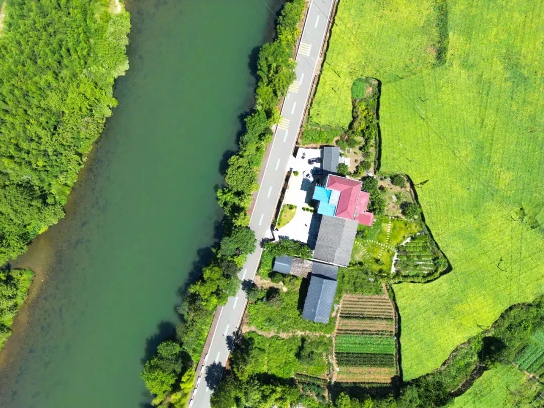 航拍返鄉(xiāng)青年陳美在建陽區(qū)麻沙鎮(zhèn)杜潭村開的民宿(張行健 攝)